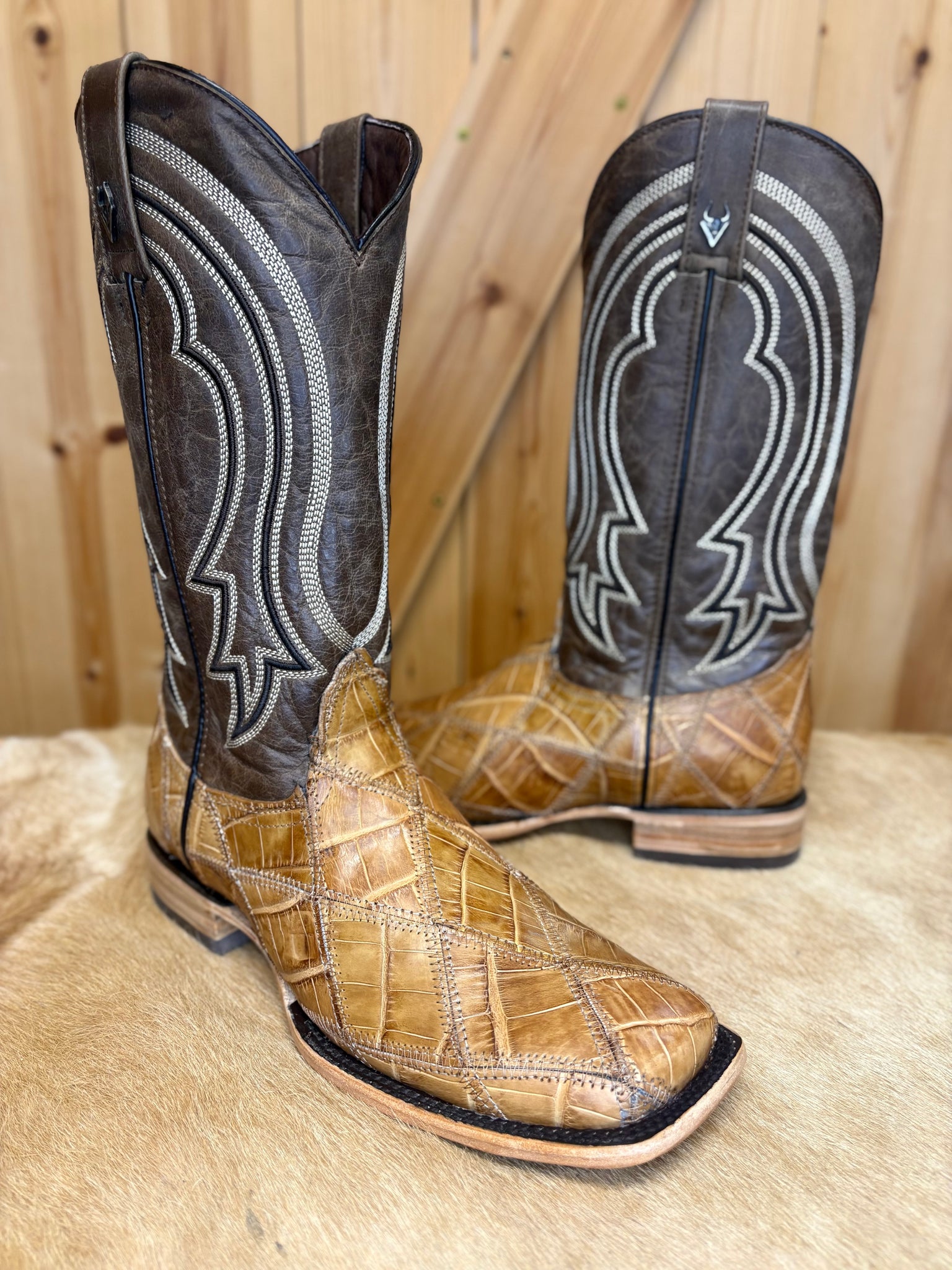 Crafted with high-quality Caiman leather, Honey Caiman Patchwork boots offer durability and style.