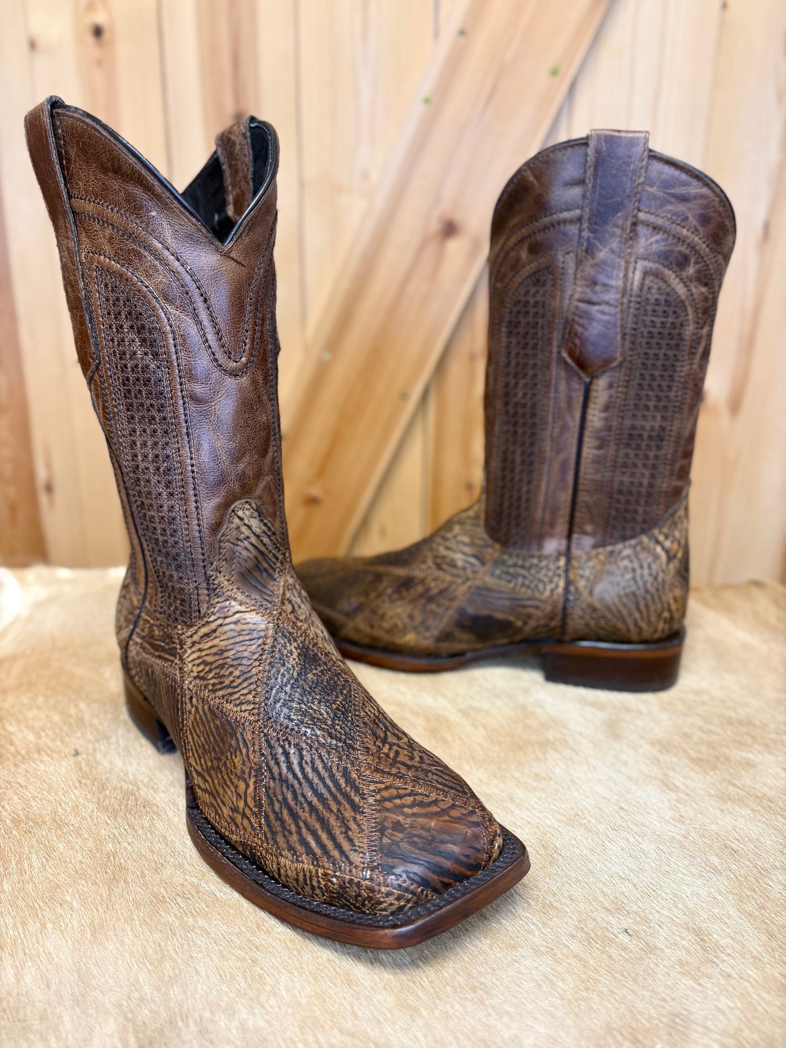 -a handcrafted boot made from durable shark leather in a unique patchwork style. Expertly crafted by artisans, this boot features a stacked leather heel and a leather sole with rubber for added traction. Elevate your style while supporting skilled craftsmanship.